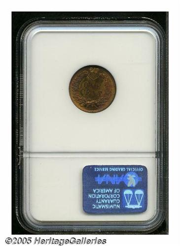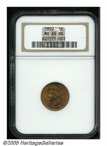<B>1892<1C> MS65 Red NGC.</B></I> This amazingly attractive Gem reveals bright lime-green and streaky crimson toning on both sides. The features are very sharply struck throughout, and the well preserved surfaces seem nearly blemish-free. Die clash marks (as struck) are noticeable on obverse and reverse alike. Population: 36 in 65 Red, 4 finer (4/05).