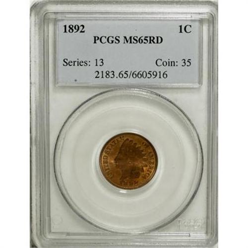 <B>1892 1C MS65 Red PCGS.</B></I> The surfaces are beautifully red and shimmer like the last remaining embers of an autumn campfire. The strike has moments of weakness at the peripheries, and a few darker spots are noted on both sides, but the overall appeal is every bit Gem. <BR><BR><B>Coin Engraver:</B> James B. Longacre<BR><BR><b>Shipping:</b> Coins & Currency (<a target="_blank" href="http://www.heritageauctions.com/common/shipping.php">view shipping information</a>)
