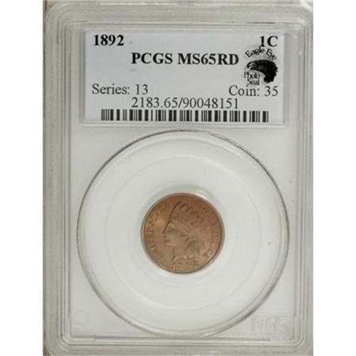 <B>1892 1C MS65 Red PCGS.</B></I> Eagle Eye Photo Seal. Vibrant copper-orange with elements of rose on the well-defined devices. This Gem offers excellent visual appeal for this late 19th century issue. PCGS has certified 12 finer Red examples (12/07).<BR><BR><B>Coin Engraver:</B> James B. Longacre<BR><BR><b>Shipping:</b> Coins & Currency (<a target="_blank" href="http://www.heritageauctions.com/common/shipping.php">view shipping information</a>)