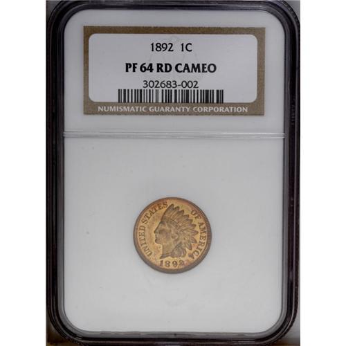 <B>1892<1C> PR64 Cameo NGC.</B></I> Sharply struck with watery fields and enticing mint-green and red-gold coloration. Minor obverse flyspecking is noticeable mainly with the aid of magnification, yet seemingly prevents a Gem grade assessment. A conditionally scarce Cameo proof near-Gem. Census: 1 in PR64 Red Cameo, 1 finer (1/06).