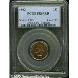 <B>1892 1C PR64 Red PCGS.</B></I> Sharply struck and lightly toned, with reflective fields and modest carbon on the obverse. Well preserved and free of contact marks or hairlines.