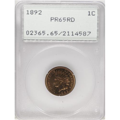 <B>1892 1C PR65 Red PCGS.</B></I> Bright orange-gold surfaces are devoid of mentionable abrasions or spots, and reveal boldly struck design elements. Mild field-motif contrast is visible when the piece is rotated under a light source. This appealing proof reposes in a first generation PCGS holder. Population: 44 in 65 Red, 15 finer (1/07).<BR><BR><b>Shipping:</b> Coins & Currency (<a target="_blank" href="http://www.heritageauctions.com/common/shipping.php">view shipping information</a>)