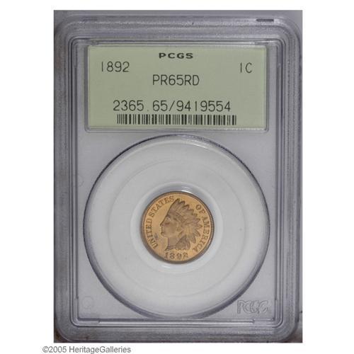 <B>1892<1C> PR65 Red PCGS.</B></I> Very attractive orange-gold color bathes each side of this exquisitely struck Indian cent proof. A couple of small flecks are noted on the reverse.