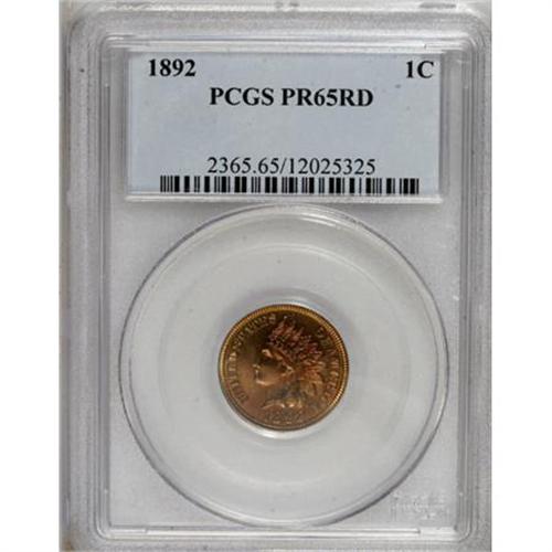 <B>1892 1C PR65 Red PCGS.</B></I> Red-gold, peach, and mint-green, with dashes of blue and red on the central reverse. An unmarked and well struck Gem that has only a few peripheral obverse pinpoint flecks. Population: 43 in 65 Red, 14 finer (10/07). <BR><BR><B>Coin Engraver:</B> James B. Longacre<BR><BR><b>Shipping:</b> Coins & Currency (<a target="_blank" href="http://www.heritageauctions.com/common/shipping.php">view shipping information</a>)