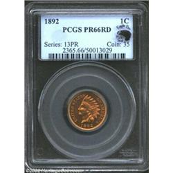 1892 1C PR66 Red PCGS. Eagle Eye Photo Seal. This is an earlier die state of the proof dies as seen by the closed Es on the reverse, in later states die polishing opens these letters. The fields are bright and mirror-like, indicating this may have been one of the first proofs struck. Even red color covers both sides of this nearly perfect example. Population: 11 in 66, 2 finer (10/02).From the "Newmismatist" Collection; the All-Time #1 PCGS Registry Set. Important notice: We expect to be auctioning lots at the rate of 200-250 per hour. Sometimes eBay Premier live bid software cannot keep up with that pace, so we strongly recommend that you place a realistic proxy bid now as insurance to avoid disappointment. Also please note that all Heritage/CAA lots purchased through eBay Premier carry a 20% Buyer's Premium. Please make sure you read the Terms and Conditions.
