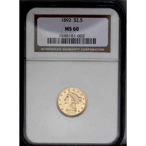 <B>1892<$2 1/2> MS60 NGC.</B></I> A khaki-orange piece with great luster and a sharp strike. Multiple abrasions and a few tiny pinscratches in the fields define the grade.