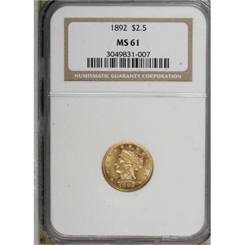 <B>1892 $2 1/2 MS61 NGC.</B></I> NGC Census: (22/62). PCGS Population (13/48). Mintage: 2,440. Numismedia Wsl. Price for NGC/PCGS coin in MS61: $820. (#7844)<BR><BR><B>Coin Engraver:</B> Christian Gobrecht<BR><BR><b>Shipping:</b> Coins & Currency (<a target="_blank" href="http://www.heritageauctions.com/common/shipping.php">view shipping information</a>)