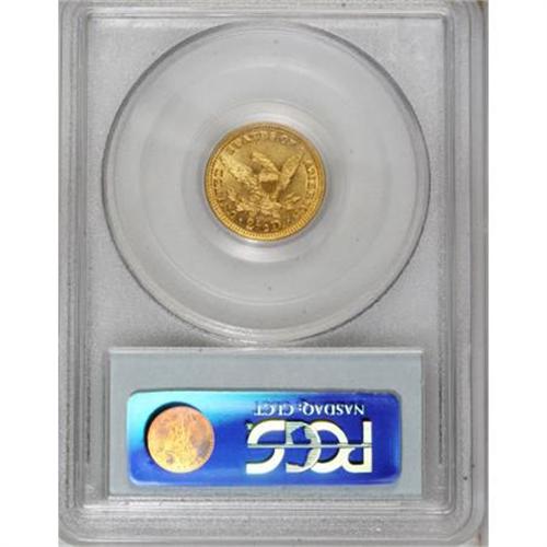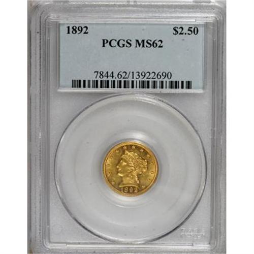 <B>1892 $2 1/2 MS62 PCGS.</B></I> Sharply struck with bold lime-green toning and an intense cartwheel sheen across both sides. Wispy contact marks limit the grade. An appealing Mint State example of this popular, low mintage issue. Just 2,440 pieces were produced. Population: 13 in 62, 35 finer (8/07). <BR><BR><B>Coin Engraver:</B> Christian Gobrecht<BR><BR><b>Shipping:</b> Coins & Currency (<a target="_blank" href="http://www.heritageauctions.com/common/shipping.php">view shipping information</a>)