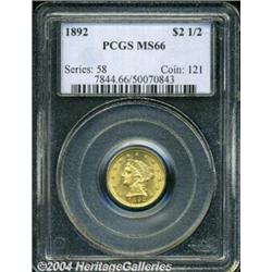 <B>1892<$2 1/2> MS66 PCGS.</B></I> The 1892 is a scarce, low mintage issue in the Coronet Quarter Eagle series with only 2,440 business strikes produced. This example features bright apricot-gold and light-green surfaces that are exquisitely preserved. A few light, unobtrusive marks scattered about are not in the least bothersome. The design elements are boldly impressed throughout, further enhancing the eye appeal of this magnificent specimen. Population: 5 in 66, 3 finer (3/04). <BR><BR><B>Important notice:</B> Heritage usually auctions material at the rate of 200-250 lots per hour. On some occasions eBay Live bid software or the Internet may not be able to keep up with the pace of the auction. We recommend placing a realistic absentee bid now as insurance to avoid disappointment. Occasionally the auctioneer may eliminate or reject an eBay Live bid, and the auctioneer may also reopen a lot after the close of the eBay live bidding (usually because we missed an audience bid), and may reject your bid even if it shows you as the winning bidder. By bidding via eBay Live, you agree that Heritage may award the lot to another bidder at its sole discretion under the circumstances described above or any other reasonable circumstances. Since eBay bids are not shown to us until we open the lot on the floor, we treat those bids just like floor bids. In most cases the floor responds before the eBay bid is presented to us, due to Internet lag time, so for consistency we have made it a policy that floor bids are always considered first over tie eBay live bids. Also please note that all Heritage lots purchased through eBay Live carry a 20% Buyer's Premium. Please make sure you read the Terms and Conditions before you bid. </span></font></tr></table></td></tr></table>