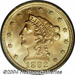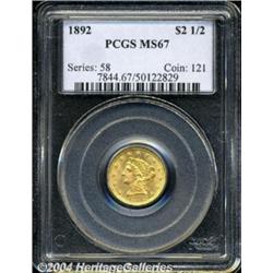 <B>1892<$2 1/2> MS67 PCGS.</B></I> A scant 2,440 pieces were coined this year and very high grade pieces such as this one are in extremely short supply. Only three other coins have been certified in MS67 by PCGS with none finer (3/04). Very sharply struck throughout, the surfaces are bright and highly lustrous. Each side shows a generous overlay of subtle reddish patina that adds even more visual appeal. For pedigree purposes, there is a tiny mark on Liberty's lower neck, and a dark toning spot to the left of the first 2 in the denomination on the reverse. <BR><BR><B>Important notice:</B> Heritage usually auctions material at the rate of 200-250 lots per hour. On some occasions eBay Live bid software or the Internet may not be able to keep up with the pace of the auction. We recommend placing a realistic absentee bid now as insurance to avoid disappointment. Occasionally the auctioneer may eliminate or reject an eBay Live bid, and the auctioneer may also reopen a lot after the close of the eBay live bidding (usually because we missed an audience bid), and may reject your bid even if it shows you as the winning bidder. By bidding via eBay Live, you agree that Heritage may award the lot to another bidder at its sole discretion under the circumstances described above or any other reasonable circumstances. Since eBay bids are not shown to us until we open the lot on the floor, we treat those bids just like floor bids. In most cases the floor responds before the eBay bid is presented to us, due to Internet lag time, so for consistency we have made it a policy that floor bids are always considered first over tie eBay live bids. Also please note that all Heritage lots purchased through eBay Live carry a 20% Buyer's Premium. Please make sure you read the Terms and Conditions before you bid. </span></font></tr></table></td></tr></table>