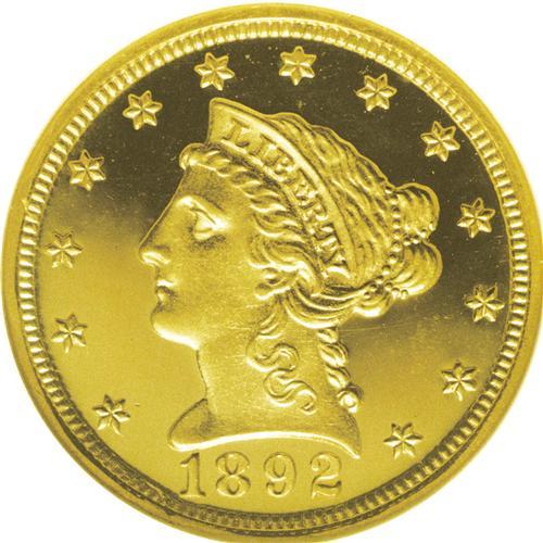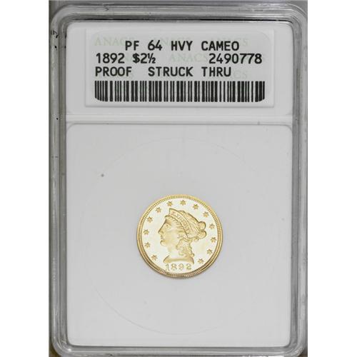 <B>1892<$2 1/2>--Struck Through--PR64 Heavy Cameo ANACS.</B></I> The 1892 is a better date within the Liberty quarter eagle series. 105 proofs were struck, in addition to 2,440 business strikes. Both proof and commercial mintages would be exceeded every year thereafter, until the Indian type was introduced in 1908. This undisturbed specimen features frosty devices and darkly mirrored fields. The contrast is formidable, particularly by the standards of 19th century proofs. Striking incompleteness is limited to a few obverse dentils near 7 o'clock, and on the eagle near the base of the shield. The latter area has softer detail because a small amount of foreign matter was imbedded in the recesses of the reverse die. Undoubtedly, a number of other proof 1892 quarter eagles share the same strike-through; for example, Lot 8650 in our January 2005 FUN Signature auction.