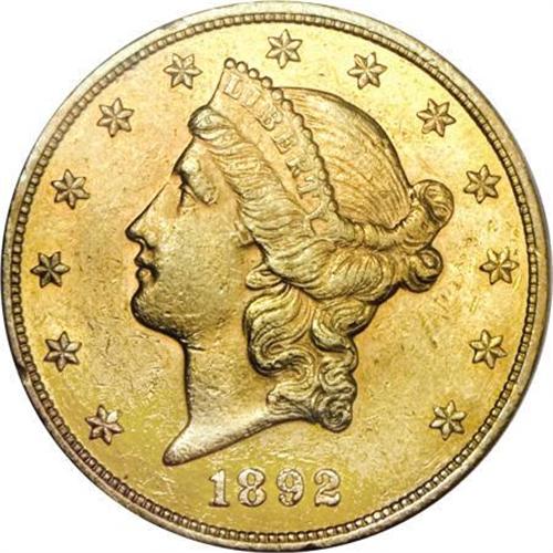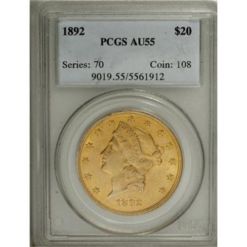 <B>1892 $20 AU55 PCGS.</B></I> The low mintage of 4,400 coins has yielded relatively few survivors, as Garret and Guth (2006) estimate that only 150 to 200 pieces remain. This highly lustrous double eagle displays enticing greenish-gold and coppery-orange coloration, and the fields exhibit considerable semi-prooflike flash. Scattered marks and slight highpoint wear limit the grade. <BR><BR><B>Coin Engraver:</B> James B. Longacre<BR><BR><b>Shipping:</b> Coins & Currency (<a target="_blank" href="http://www.heritageauctions.com/common/shipping.php">view shipping information</a>)