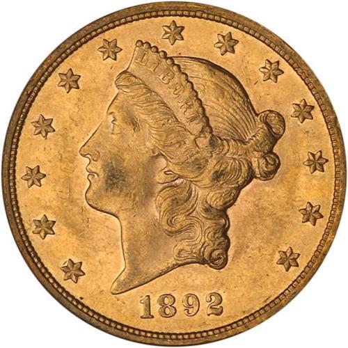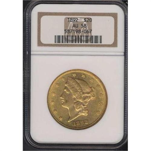 <b>1892 $20 Liberty. NGC graded AU58.</b> Why the low mintage for 1892? The same reason we've been describing before: It all traces back to what led up to the money crises and subsequent business Panic of 1893. Because of a quirk in America's paper money setup, gold coins and bullion were being drained out of the Treasury in increasing numbers after 1890. The problem go so bad that President Cleveland had to plead with banker J. P. Morgan for a massive gold loan to the government to meet the demand.
