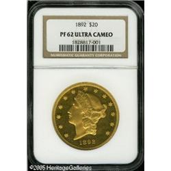 <B>1892 $20 PR62 Ultra Cameo NGC.</B></I> For a coin that is so rare in the absolute sense, it seems odd that we should have two Ultra Cameo 1892 double eagles in the same auction. Only 18 to 25 coins are believed extant today with precious few that show Deep or Ultra Cameo contrast. In fact, this is the only PR62 that NGC has certified with a meager three pieces finer (1/05). The surfaces are obviously hairlined, but the orange-peel texture of the fields is still plentifully obvious with magnification. The devices are heavily frosted and present a strong white-on-black contrast against the "black" fields.<BR><I>From The Mike Jacobson Collection.</B></I> Lot:9427