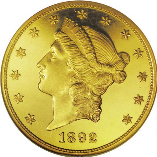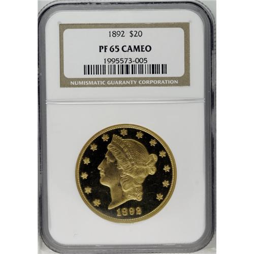 <B>1892<$20> PR65 Cameo NGC.</B></I> Although not quite as rare as the Philadelphia issue from the preceding year, the 1892 is a significant date within the Liberty double eagle series. The bulk of production this year was delegated to the half eagle and eagle denominations. A mere 93 proofs were originally produced in addition to only 4,430 business strikes, and the number of survivors in each category is far too small to satisfy today's ever-expanding group of gold collectors. Apparently more than half of the proof production went unsold and was melted at year's end or was eventually spent, since proof double eagles did not carry a significant numismatic premium above their already significant face value until well into the twentieth century.<BR> As with all of the proof 1892 twenties we have been privileged to offer, this specimen boasts appreciable contrast between the mirrored fields and the design elements. The color is a pleasing yellow-gold and the strike is executed with pinpoint precision. A thin veil of streaky haziness is seen over much of the reverse, which may explain why this elusive Gem Proof did not receive the Ultra Cameo designation. An important opportunity for the advanced double eagle specialist. Census: 1 in 65 Cameo, 0 finer (4/06).