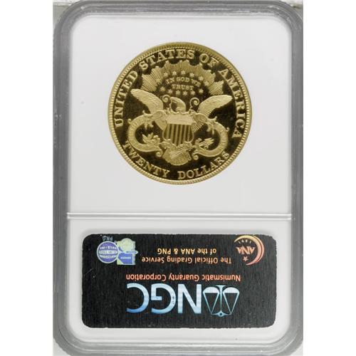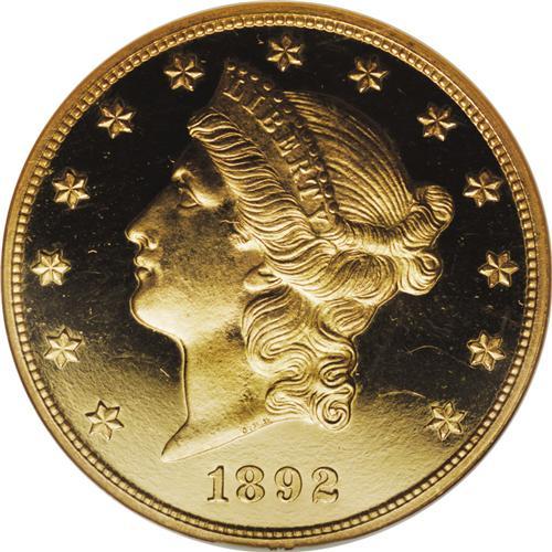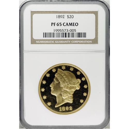 <B>1892 $20 PR65 Cameo NGC.</B></I> Although not quite as rare as the Philadelphia issue from the preceding year, the 1892 is a significant date within the Liberty double eagle series. The bulk of production this year was delegated to the half eagle and eagle denominations and only at the San Francisco facility was the production of double eagles pursued in earnest. A mere 93 proofs were originally produced in addition to only 4,430 business strikes, and the number of survivors in each category is far too small to satisfy today's ever-expanding group of gold collectors. Apparently more than half of the proof production went unsold and was melted at year's end or was eventually spent, since proof double eagles did not carry a significant numismatic premium above their already significant face value until well into the twentieth century.<BR> As with all of the proof 1892 twenties we have been privileged to offer, including the PCGS PR65 Deep Cameo that follows, this specimen boasts appreciable contrast between the mirrored fields and the design elements. The color is a pleasing yellow-gold and the strike is executed with pinpoint precision. A thin veil of streaky haziness is seen over much of the reverse, which may explain why this elusive Gem Proof did not receive the Ultra Cameo designation. An important opportunity for the advanced double eagle specialist. Census: 1 in 65, 0 finer (11/06).<BR><BR><b>Shipping:</b> Coin/Currency (<a target="_blank" href="http://www.heritageauctions.com/common/shipping.php">view shipping information</a>)