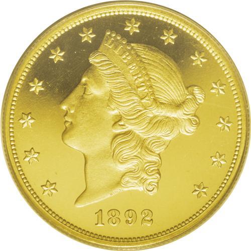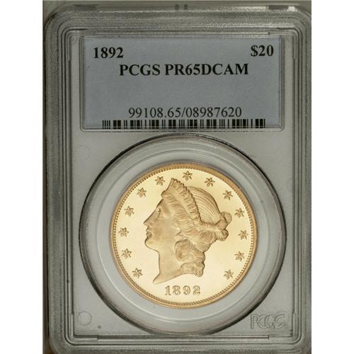 <B>1892<$20> PR65 Deep Cameo PCGS.</B></I> Although the mintage of 93 coins is the second highest of any proof double eagle coined in the 1890s, the related business strike mintage of this date was just 4,430 coins, the second lowest mintage of any date in the 1890s. This latter detail is an extremely important consideration as it limits the available supply for date collectors.<BR> This example is an impressive Gem that features rich orange-gold color, deeply mirrored fields, and remarkable contrast. The devices are highly lustrous with frosty texture. Every design detail is sharply impressed with no sign of weakness on either side. A few faint hairlines limit the grade, but do not change the aesthetic appeal of this lovely jewel.<BR> In the Pittman catalog, David Akers discussed the difference between proof mintage and proof distribution, an important concept that is worth repeating: "The 93 piece mintage figure for proof 1892 double eagles is misleading, in the sense that it might give one the impression that proofs of this date are only moderately rare. However, it is important to recognize that a mintage figure for any proof issue represents only the number struck, not the number actually sold. It was common practice for the Mint to strike a number of proofs (how the figure was determined is not known) and then use this existing supply to fill orders throughout the year. At year's end (usually January or February of the following year, to be exact), the unsold pieces were melted. Now, in 1892, it certainly was not very likely that 92 people were willing to pay $20.50 for a proof double eagle (face value plus a $0.50 'proofing' charge), and so it is probable that half, or even fewer, of the original mintage were actually distributed." Today, only about 20 or 25 examples are known, and the only rivals to this example that we recall are the Gem Pittman Collection coin