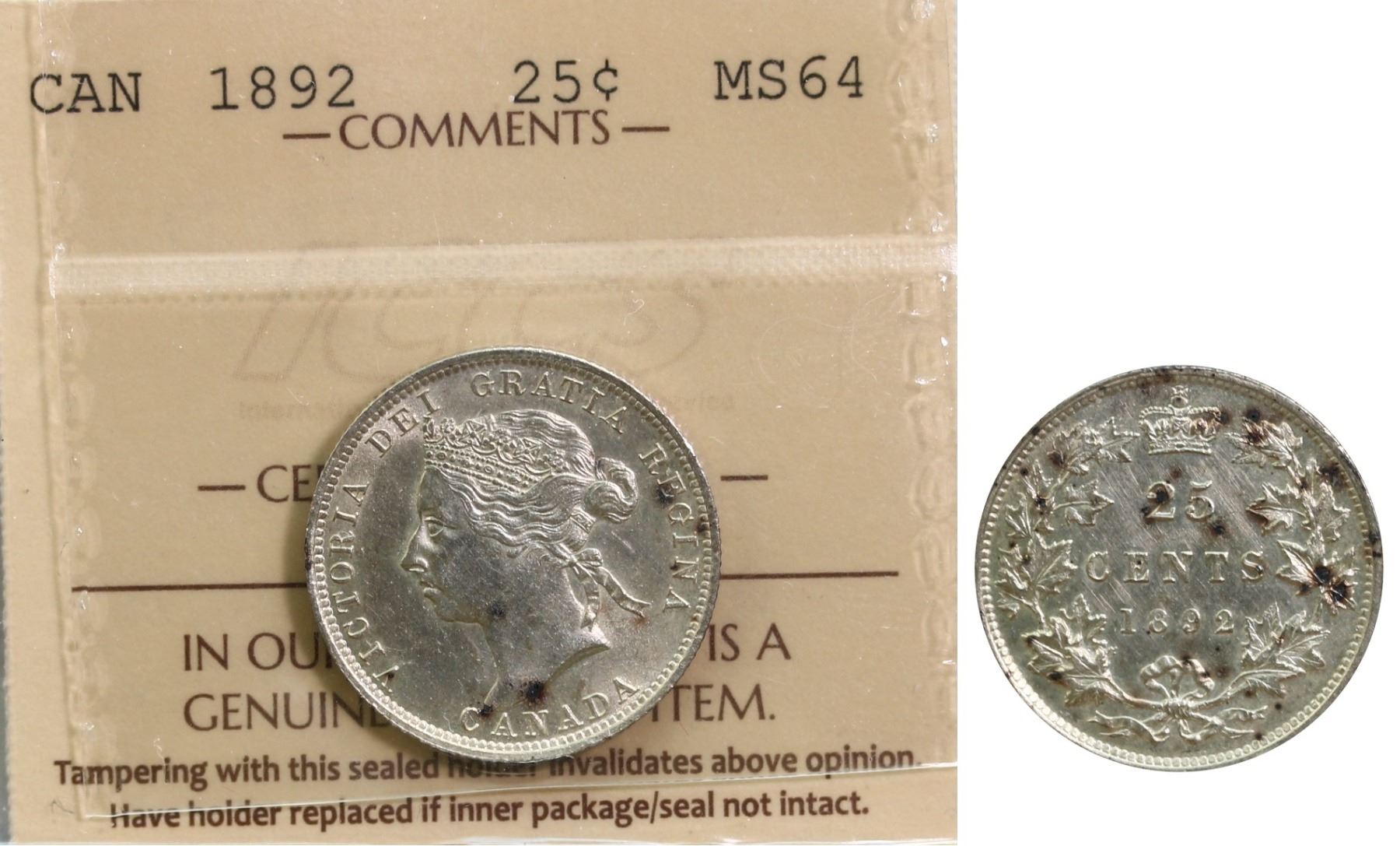 1892 25¢ ICCS Choice Mint State-64. A nice example with eye appeal.