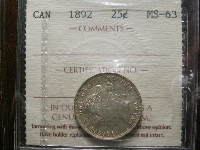 1892 25¢ ICCS MS63. Another fully lustrous Victorian example in High grade.