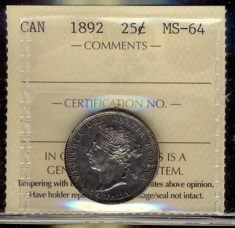 1892 25¢ ICCS MS64. Superbly toned. Scarce!