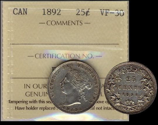 1892 25¢ ICCS VF30. Well struck with light lustre.