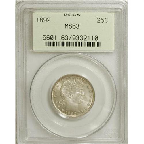 <B>1892 25C MS63 PCGS.</B></I> PCGS Population (303/459). NGC Census: (230/564). Mintage: 8,237,245. Numismedia Wsl. Price for NGC/PCGS coin in MS63: $244. (#5601)<BR><BR><b>Shipping:</b> Coins & Currency (<a target="_blank" href="http://www.heritageauctions.com/common/shipping.php">view shipping information</a>)