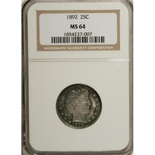 <B>1892 25C MS64 NGC.</B></I> NGC Census: (320/249). PCGS Population (261/198). Mintage: 8,237,245. Numismedia Wsl. Price for NGC/PCGS coin in MS64: $472. (#5601)<BR><BR><b>Shipping:</b> Coins & Currency (<a target="_blank" href="http://www.heritageauctions.com/common/shipping.php">view shipping information</a>)