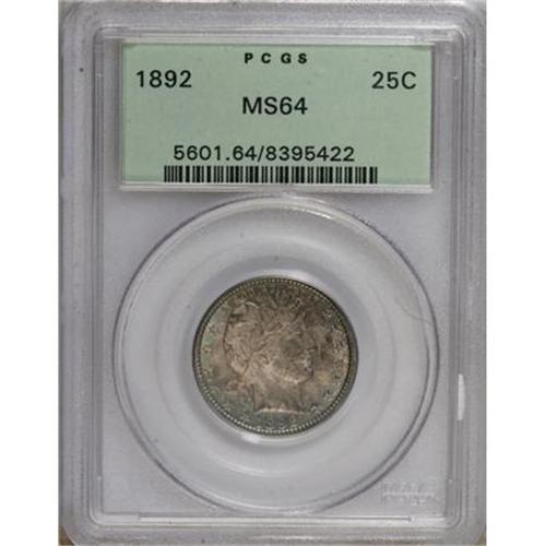 <B>1892 25C MS64 PCGS.</B></I> PCGS Population (264/208). NGC Census: (321/249). Mintage: 8,237,245. Numismedia Wsl. Price for NGC/PCGS coin in MS64: $472. (#5601)<BR><BR><B>Coin Engraver:</B> Charles E. Barber<BR><BR><b>Shipping:</b> Coins & Currency (<a target="_blank" href="http://www.heritageauctions.com/common/shipping.php">view shipping information</a>\)