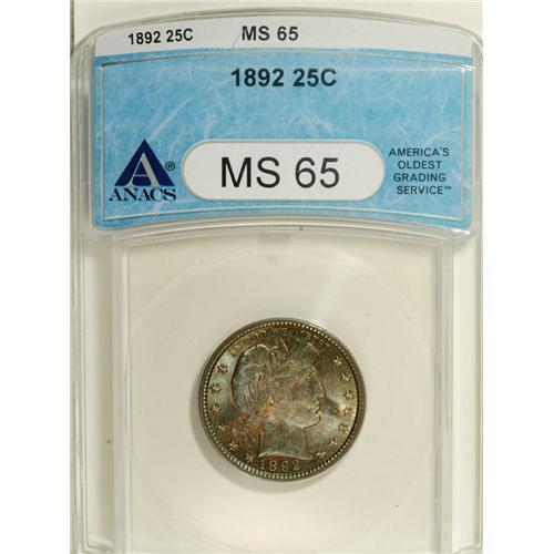 <B>1892 25C MS65 ANACS.</B></I> Type Two Reverse. Beautiful multicolored patination with sky-blue and champagne-pink predominating. Both sides emit radiant luster, and the strike, as usual on this first-year issue, is essentially unassailable. A couple of tiny ticks are noted beneath Liberty's eye.<BR><BR><b>Shipping:</b> Coins & Currency (<a target="_blank" href="http://www.heritageauctions.com/common/shipping.php">view shipping information</a>)