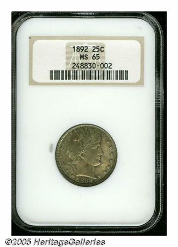 <B>1892<25C> MS65 NGC.</B></I> Type One Reverse. Peach, cream-gray, and aquamarine colors invigorate this highly lustrous Gem. The strike is good although not needle-sharp. Gorgeously preserved, and the eye appeal is considerable.