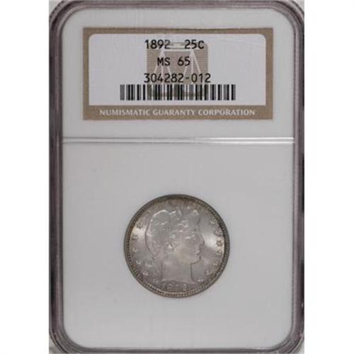 <B>1892 25C MS65 NGC.</B></I> Type One Reverse. This first-year type candidate displays untoned centers with russet peripheral shadings. Sharply struck, and distraction-free save for a few as struck planchet voids on Liberty's cheek.<BR><I>From The Southwest Collection.</B></I><BR><BR><B>Coin Engraver:</B> Charles E. Barber<BR><BR><b>Shipping:</b> Coins & Currency (<a target="_blank" href="http://www.heritageauctions.com/common/shipping.php">view shipping information</a>)