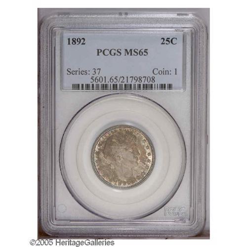 <B>1892<25C> MS65 PCGS.</B></I> Type Two Reverse. Deep golden-brown and turquoise-green colors blend throughout this satiny and razor-sharp Gem. The obverse is spectacularly preserved. An interesting die break (as made) on the bust truncation above the 1 in the date.