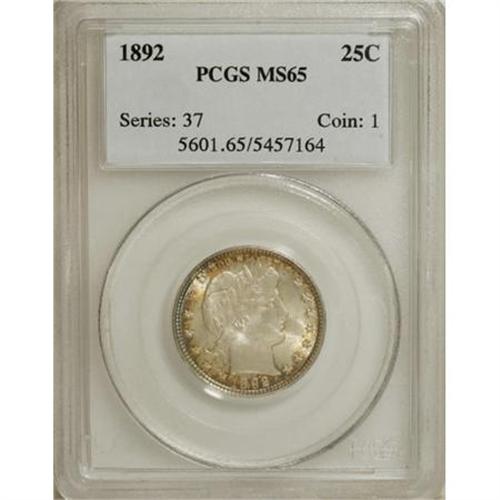 <B>1892 25C MS65 PCGS.</B></I> PCGS Population (102/106). NGC Census: (145/104). Mintage: 8,237,245. Numismedia Wsl. Price for NGC/PCGS coin in MS65: $1,025. (#5601)<BR><BR><B>Coin Engraver:</B> Charles E. Barber<BR><BR><b>Shipping:</b> Coins & Currency (<a target="_blank" href="http://www.heritageauctions.com/common/shipping.php">view shipping information</a>\)