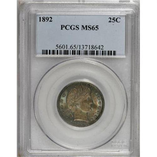 <B>1892 25C MS65 PCGS.</B></I> Type One Reverse. QUARTER and the olive branch are lightly die doubled. This is an amazing Gem example that is simply one of the most attractive Barber quarters that we have examined in recent years. Well struck, lustrous, and nearly mark-free, the piece is decorated on each side by a variegated array of turquoise-green, olive-drab, and tan coloration.<BR><BR><B>Coin Engraver:</B> Charles E. Barber<BR><BR><b>Shipping:</b> Coins & Currency (<a target="_blank" href="http://www.heritageauctions.com/common/shipping.php">view shipping information</a>)