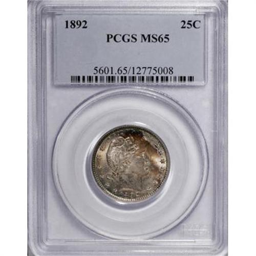 <B>1892 25C MS65 PCGS.</B></I> Type Two Reverse. UNITED and other nearby legends are minutely die tripled. This lustrous first-year type coin is well struck except for the fletchings and right (facing) claw. The obverse has golden-brown and aquamarine toning, and the portrait has a couple of faint marks.<BR><BR><B>Coin Engraver:</B> Charles E. Barber<BR><BR><b>Shipping:</b> Coins & Currency (<a target="_blank" href="http://www.heritageauctions.com/common/shipping.php">view shipping information</a>)