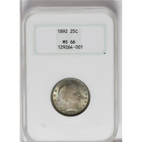 <B>1892<25C> MS66 NGC.</B></I> Type One Reverse. The first year of issue of this popular Charles Barber-designed coinage. Despite its high initial mintage and seeming ubiquitous availability as a date, in this grade it is much more difficult to find. This specimen is further enhanced in desirability by its wonderful blue-green and amber iridescent patina. Census: 81 in 66, 24 finer (8/06).