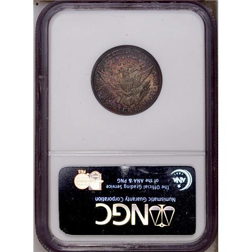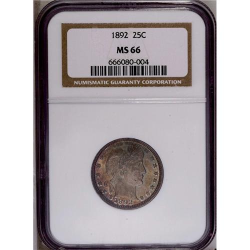 <B>1892<25C> MS66 NGC.</B></I> Type One Reverse. Swirls of sea-green, cobalt-blue, yellow-gold and bright rose toning dominate each side. Fully struck and nearly unabraded, this lustrous and impressive premium Gem would be a wonderful addition to a high quality first year of issue type set.