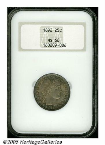 <B>1892<25C> MS66 NGC.</B></I> Type Two Reverse. Deep golden-brown and forest-green colors bathe this magnificently preserved and lustrous first year premium Gem. In an early generation NGC holder.