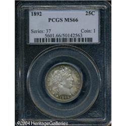 1892 25C MS66 PCGS. Type Two Reverse. Beautiful go <B>1892 25C MS66 PCGS.</B></I> Type Two Reverse. Beautiful golden-brown, sky-blue, and honey colors enrich this lustrous and exquisitely struck premium Gem. The portrait of Liberty, which normally draws contact marks like a magnet, is undisturbed on the present piece. A lovely type coin. Population: 65 in 66, 14 finer (10/04). <BR><BR><B>Important notice:</B> Heritage usually auctions material at the rate of 200-250 lots per hour. On some occasions eBay Live bid software or the Internet may not be able to keep up with the pace of the auction. We recommend placing a realistic absentee bid now as insurance to avoid disappointment. Occasionally the auctioneer may eliminate or reject an eBay Live bid, and the auctioneer may also reopen a lot after the close of the eBay live bidding (usually because we missed an audience bid), and may reject your bid even if it shows you as the winning bidder. By bidding via eBay Live, you agree that Heritage may award the lot to another bidder at its sole discretion under the circumstances described above or any other reasonable circumstances. Since eBay bids are not shown to us until we open the lot on the floor, we treat those bids just like floor bids. In most cases the floor responds before the eBay bid is presented to us, due to Internet lag time, so for consistency we have made it a policy that floor bids are always considered first over tie eBay live bids. Also please note that all Heritage lots purchased through eBay Live carry a 20% Buyer's Premium. Please make sure you read the Terms and Conditions before you bid. This lot is being auctioned in conjunction with a live floor auction by Heritage Galleries & Auctioneers. All final auction and invoice information will be supplied by Heritage Galleries & Auctioneers, and all other information should be considered preliminary. Lot:5905