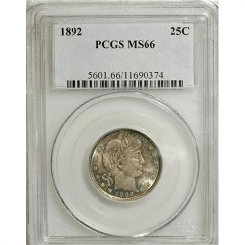 <B>1892 25C MS66 PCGS.</B></I> Type One Reverse. Sea-green and cherry-red toning enriches this lustrous and splendidly preserved Premium Gem. The strike is sharp aside from the fletchings and nearby right (facing) claw.<BR><BR><b>Shipping:</b> Coins & Currency (<a target="_blank" href="http://www.heritageauctions.com/common/shipping.php">view shipping information</a>)