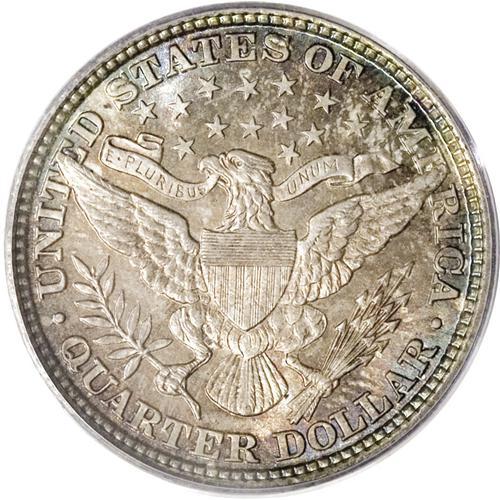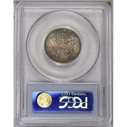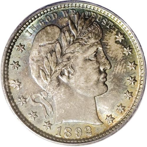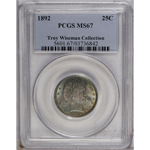 <B>1892<25C> MS67 PCGS.</B></I> Type One Reverse. The difference between Type One and Type Two quarters can be easily remembered by the mnemonic device "Now you see it, now you don't." On Type Ones, the middle serif of the E in UNITED is about halfway visible, while on Type Two quarters, the eagle's wing covers it. This phenomenal Superb Gem is not only extremely appealing in its own right, but it is also a close match in color with the 1892 Wiseman Barber half dollar that also appears in this auction. The quarter offers a delectable silver-gray obverse with iridescent light aqua and amber toning around the peripheries. The reverse boasts lovely amber and magenta patina, with glints of iridescent blue at the rim. A couple of tiny ticks are noted on Liberty's cheek, but the strike is full, even on the often-problematic right (facing) shield corner and right claw. An exemplary piece, destined for the finest type or date set.<BR><I>From The Troy Wiseman Collection.</B></I>