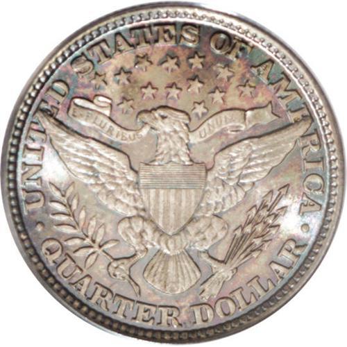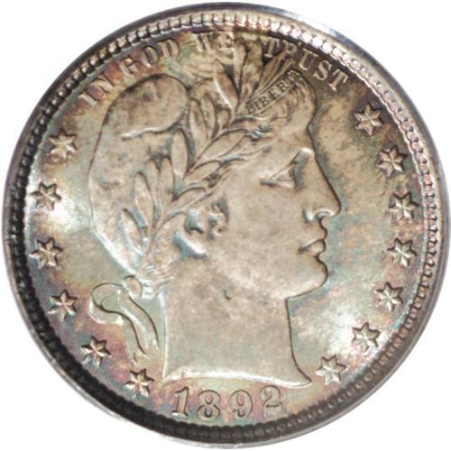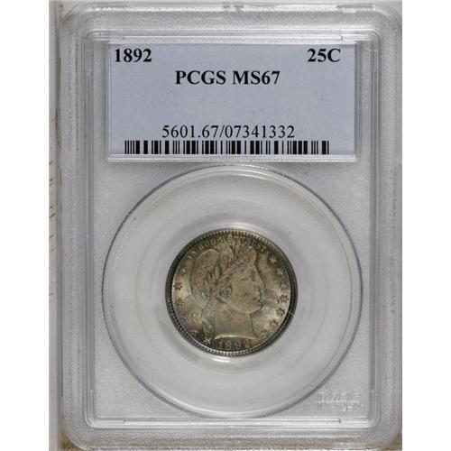 <B>1892 25C MS67 PCGS.</B></I> Type One Reverse. Only a few other first-year coins have the availability in high grade to be considered the ultimate type coin for that series. A few that come immediately to mind are 1883 No Cents nickels, 1909 cents, and 1916 Mercury dimes. In each case, the novelty of the new design compelled collectors as well as the general public to set aside examples of the new design. The 1892 quarter is another coin that can be added to that list. While plentifully available in lower grades, the 1892 is extremely scarce at the MS67 level. This is an obviously original coin that shows layer upon layer of gray, blue, and rose toning. Even with the significant presence of toning, the underlying mint luster is undeniably strong and it flashes through the layers of color. Well struck; the only mark of note is a tiny planchet flaw at the juncture of Liberty's neck and jawline. Population: 20 in 67, 2 finer (12/06).<BR><BR><b>Shipping:</b> Coins & Currency (<a target="_blank" href="http://www.heritageauctions.com/common/shipping.php">view shipping information</a>)