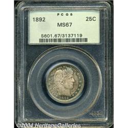 <B>1892<25C> MS67 PCGS.</B></I> Type Two Reverse, as identifiable by the position of the eagle's left (facing) wingtip relative to the E in UNITED. The first-year 1892 may be a common coin in an absolute sense, but it is not often that we can offer a solidly graded Superb Gem with attractive, original toning. Rich copper-gray and cobalt-blue colors compete for dominance on both sides with some brighter gold and blue undertones evident at direct angles. Vibrant mint frost swirls beneath the patination, and the fully impressed features are fully appreciable in the absence of bothersome abrasions. A tiny swirl of slightly deeper color behind Liberty's mouth is noted solely for accuracy. Population: 12 in 67, 1 finer (3/04).<BR><I>Ex: Charlotte ANA Signature Sale (Heritage, 3/03), lot 5722, which realized $3,450.</B></I><BR><I>From the JFS Collection.</B></I> <BR><BR><B>Important notice:</B> Heritage usually auctions material at the rate of 200-250 lots per hour. On some occasions eBay Live bid software or the Internet may not be able to keep up with the pace of the auction. We recommend placing a realistic absentee bid now as insurance to avoid disappointment. Occasionally the auctioneer may eliminate or reject an eBay Live bid, and the auctioneer may also reopen a lot after the close of the eBay live bidding (usually because we missed an audience bid), and may reject your bid even if it shows you as the winning bidder. By bidding via eBay Live, you agree that Heritage may award the lot to another bidder at its sole discretion under the circumstances described above or any other reasonable circumstances. Since eBay bids are not shown to us until we open the lot on the floor, we treat those bids just like floor bids. In most cases the floor responds before the eBay bid is presented to us, due to Internet lag time, so for consistency we have made it a policy that floor bids are always considered first over tie eBay live bids. Also please note that all Heritage lots purchased through eBay Live carry a 20% Buyer's Premium. Please make sure you read the Terms and Conditions before you bid. </span></font></tr></table></td></tr></table>