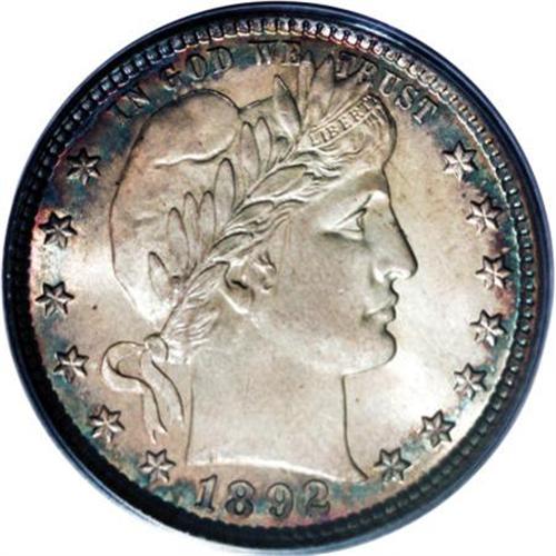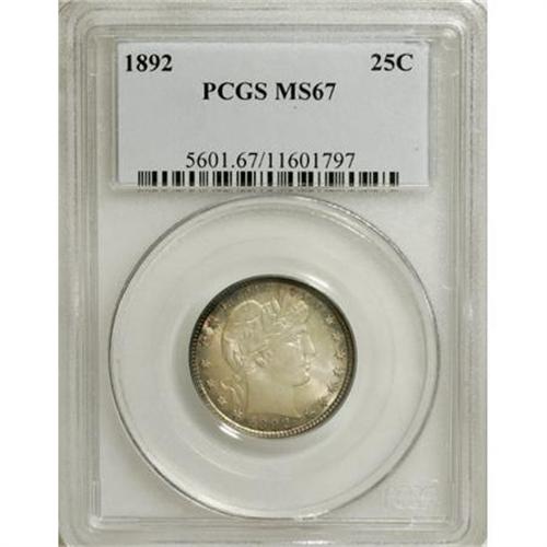 <B>1892 25C MS67 PCGS.</B></I> Type One Reverse. This lovely Superb Gem quarter displays fantastic luster radiating from well preserved surfaces that have a satiny finish. Whispers of cobalt-blue and lavender concentrate at the obverse borders, while the same colors run over the entire reverse, where they are joined by traces of light gold. A solid strike emboldens the design features, including the upper right corner of the shield, which is sometimes weak. A simply outstanding first-year-of-issue! Population: 19 in 67, 2 finer (6/07).<BR><BR><b>Shipping:</b> Coins & Currency (<a target="_blank" href="http://www.heritageauctions.com/common/shipping.php">view shipping information</a>)