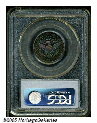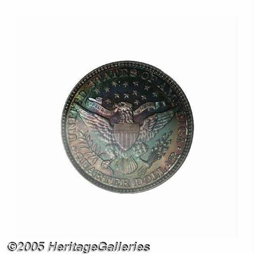 <B>1892<25C> MS68 PCGS.</B></I> Type One Reverse, as identifiable by the position of the eagle's left (facing) wingtip relative to the E in UNITED. The first-year 1892 may be a common coin in an absolute sense, but it is not often that we can offer a solidly graded Superb Gem with beautiful, original toning. A gorgeous Barber Quarter, the obverse features waves of mint-green, gold, and ruby-red color while the reverse has equally vivid blushes of pink-magenta, jade-green, antique-gold, and crimson patina. Vibrant mint frost swirls beneath the patina, and the fully impressed features are fully appreciable in the absence of bothersome abrasions, as would be expected of the assigned grade. One of only eight MS68s thus far graded by both services combined (6/05).