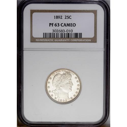 <B>1892<25C> PR63 Cameo NGC.</B></I> Type One Reverse. Richly detailed with pleasing coloration and undeniable cameo contrast on each side. A few faint slide marks on the portrait limit the grade. The Type One proof is an unheralded rarity; most 1892 proofs are Type Two.