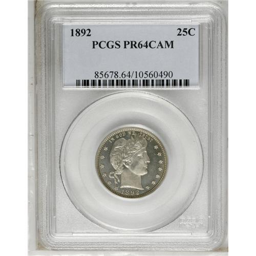 <B>1892<25C> PR64 Cameo PCGS.</B></I> Type Two Reverse. Nicely mirrored with significant contrast between the cream-colored portrait and the champagne fields. A small patch of hairlines is noted in the right obverse field, as well as a contact mark beneath the chin. Population: 18 in 64 Cameo, 14 finer (7/06).
