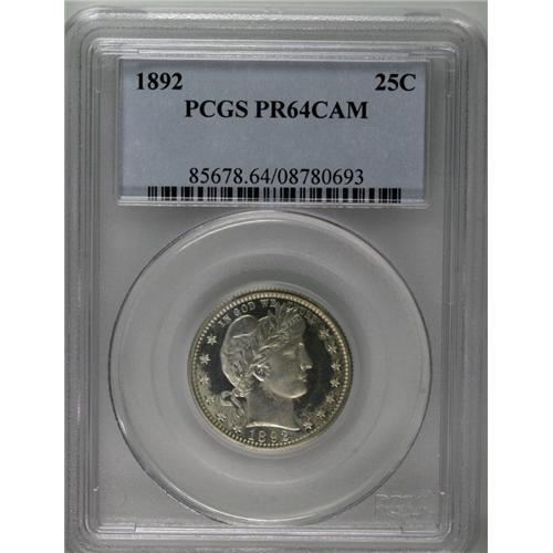 <B>1892<25C> PR64 Cameo PCGS.</B></I> Type Two Reverse. The devices are nicely frosted, and the fields are deeply mirrored, though patches of dull gray patina appear on each side. Minor hairlines are noted on the obverse. Population: 19 in 64 Cameo, 14 finer (8/06).