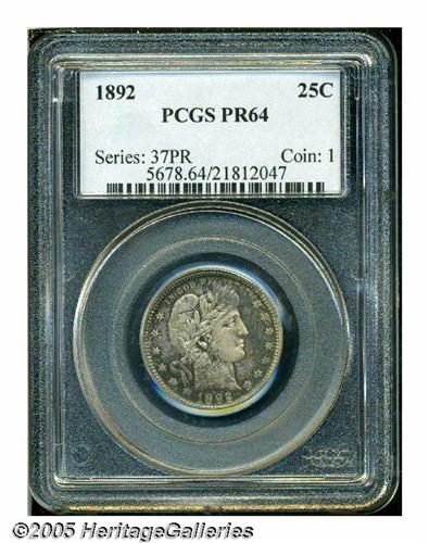 <B>1892<25C> PR64 PCGS.</B></I> Type Two Reverse. Lovely mottled violet and teal surfaces with attractive underlying flash. A few minute handling marks are noted for accuracy, but distract little.