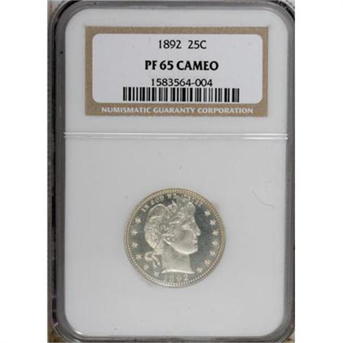 <B>1892 25C PR65 Cameo NGC.</B></I> Type Two Reverse. A gleaming Gem representative from the first year of issue, boldly impressed with essentially untoned fields and richly frosted devices. A touch of tan-orange patina graces the left reverse rim.<BR><BR><b>Shipping:</b> Coins & Currency (<a target="_blank" href="http://www.heritageauctions.com/common/shipping.php">view shipping information</a>)